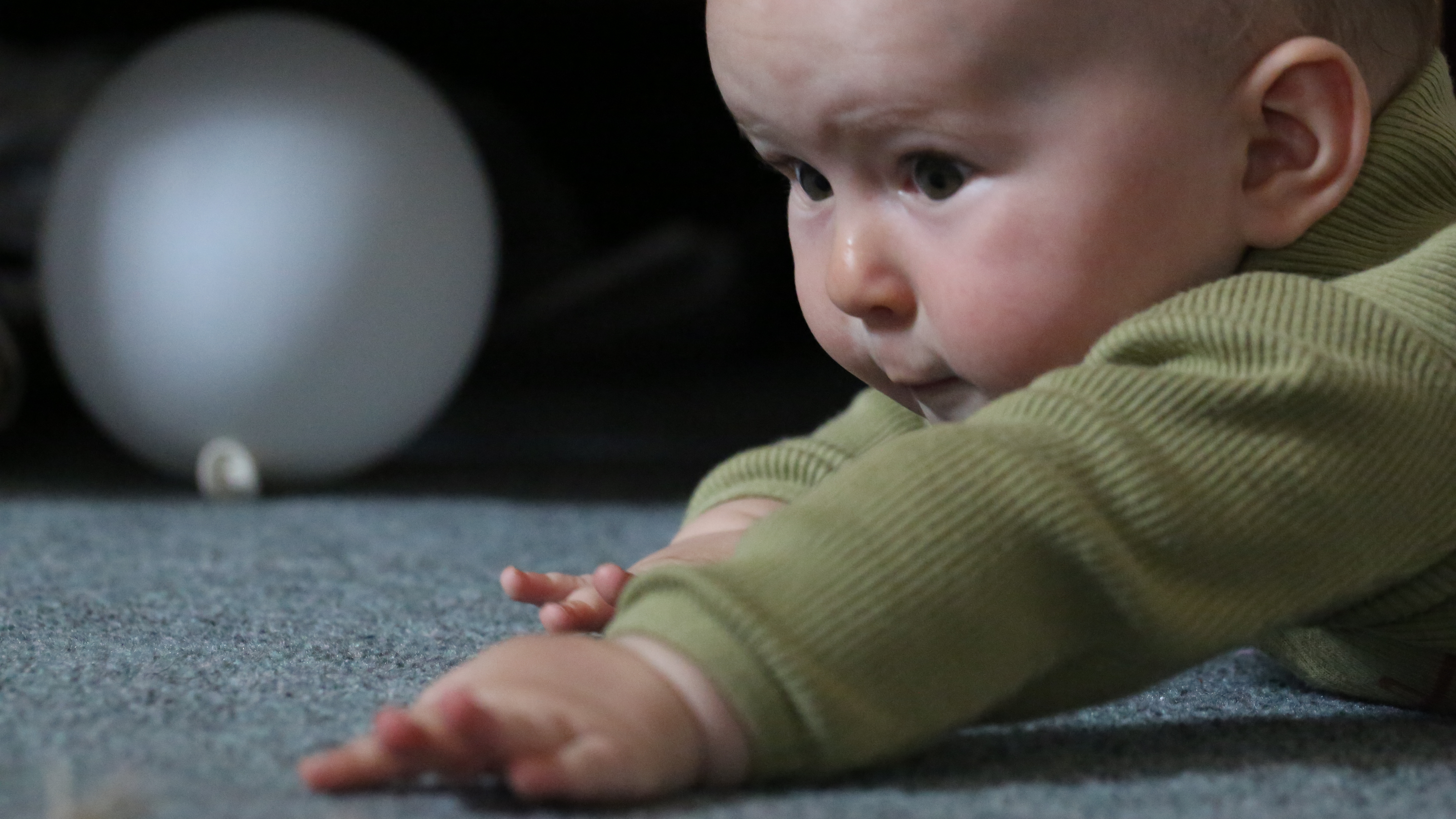 First we are introduced to a baby and mother. The scene is clearly established in a wide shot with deep focus capturing the room and space between them as the baby sets off toward her goal. From her POV the motion is slightly slowed and zoomed in on details of her mums face and the carpet in front of her. As we observe her concentrated gaze and careful movements the sound is crisp and slightly heightened; her knees dragging along the carpet, her little palms making contact with the floor.
